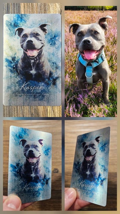 Diese hochwertige Aluminiumkarte wird individuell mit dem Foto deines Hundes gestaltet und mittels Sublimationsdruck dauerhaft in die Oberfläche eingebracht.